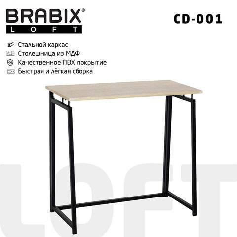 Стол на металлокаркасе BRABIX LOFT CD-001, 800х440х740 мм, складной, цвет дуб натуральный, 641211